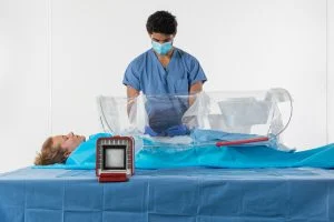 SurgiBubble’ı HEPA filtreli hava ile şişiren ve kontrollü pozitif basınç ortamı sağlayan, tekrar kullanılabilir, pille çalışan bir tıbbi cihaz.